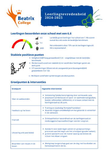 Wij hebben de uitkomsten overzichtelijk en visueel weergegeven, zodat in één oogopslag te zien is hoe onze leerlingen hun schooltijd op het Beatrix College ervaren. Ook hebben we inzichtelijk gemaakt welke acties we in de school uitvoeren om te werken aan nóg betere resultaten.